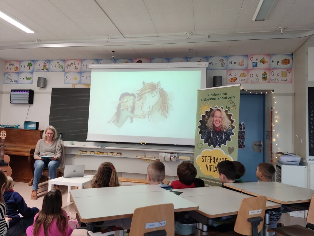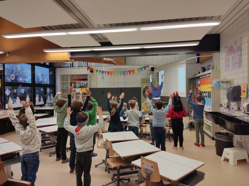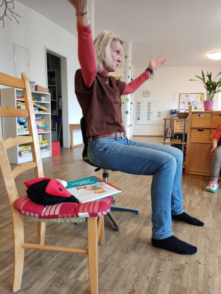 Die 23 Kinder hörten so aufmerksam zu, dass ich keine Pause machen durfte. Sie wollten unbedingt wissen, wie es weitergeht. Darum habe ich erst am Ende der Geschichte Bewegung in die wunderbaren Zuhörer und Zuhörerinnen gebracht.